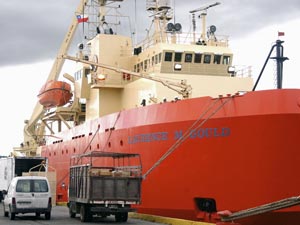 The Laurence M. Gould, docked at Punta Arenas, Chile. Following a maritime tradition, the ship is flying a "courtesy flag" of the country visited, Chile, as well as of the USA. (Photo by B. Pedler, WHOI)