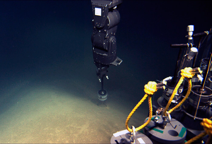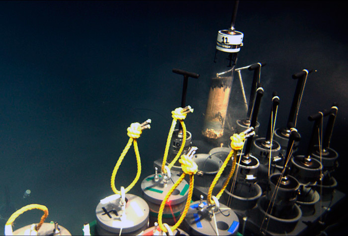 Pushcores are clear polycarbonate tubes about 13 inches long and 2.5 inches in diameter. They work by being pushed down into the seafloor. When they are pulled out, a vacuum forms and keeps a “core” of sediment in the tube. These four photos were taken by Jason’s hi-definition science camera.