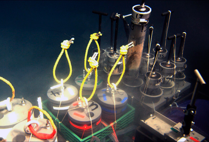 Jason carefully places each filled pushcore into a plastic quiver for the journey back to the surface. To the left of the pushcores, you can see the large chamberpots that were filled with sediments scooped up by an ice scoop.