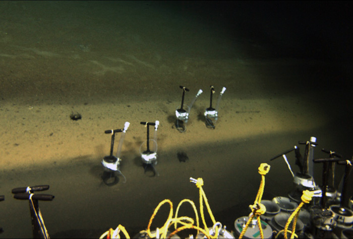 Visibility was much better and the zones on the seafloor were clearer in Discovery Basin than in Urania Basin. In this screen grab from the Jason video camera, you can see injection cores that Jason placed in a pale strip about 40 cm wide that researchers think is the bathtub ring where the upper part of the halocline meets the seafloor, and a darker zone that researchers think is where the lower part of the halocline meets the seafloor. The reddish-beige area at the top is normal seafloor.
