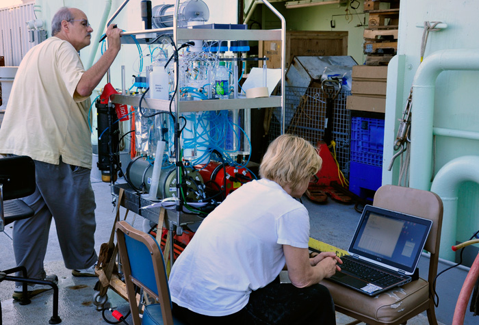 On the starboard deck behind the Main Lab, Dr. Craig Taylor and chief scientist Dr. Ginny Edgcomb work to figure out how to get SID-ISMS back in the water and sampling again.