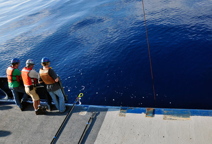Jason team member Hugh Popenoe and ship’s crew members Patrick Hennessy and Richie Barnes watch and wait as Medea, the companion vehicle for Jason, nears the surface. Weather has been great during the whole cruise, but on Saturday the sea was almost completely smooth.