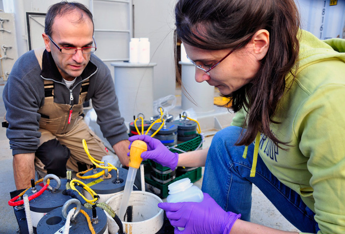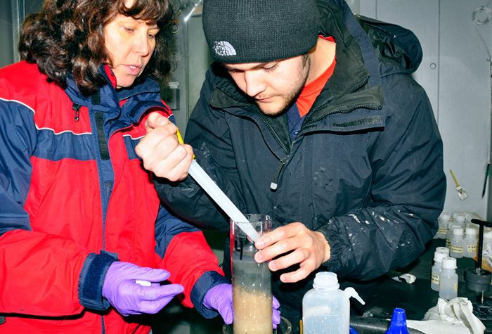 Dr. Joan Bernhard advises Colin Morrison as he draws the water off a pushcore. It is important to do this very carefully, so the sediments are not stirred up. Joan and Colin are bundled up in coats because the work is done in a cold room to help keep the samples from degenerating.