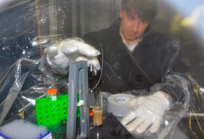 Material from every pushcore will be tested for concentrations of oxygen and sulfide. To prevent contamination by the oxygen in air, the sample is kept inside a plastic tent (the “glove bag”) filled with nitrogen. The person doing the test, however, must stay outside the tent. Here, Hans-Werner Breiner of the Technical University of Kaiserslautern measures the oxygen level in a sediment sample from Urania Basin.