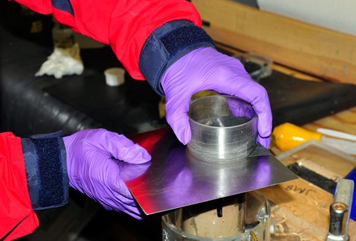 Each pushcore was mounted in a holder so 1-cm-thick slices could be cut from it, starting from the top and going to 3 cm deep in the core. Here, Joan uses a piece of stainless steel to slice through the core.