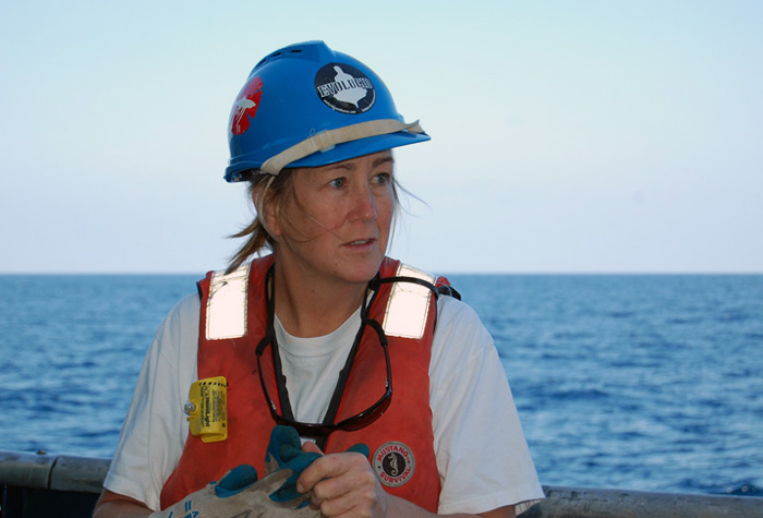 Shipboard Scientific Services Group technician (SSSG) Allison Heater after the successful deployment of an instrument. Hardhats and safety work vests must be worn by all those involved in the deployment or recovery of an instrument. Photo by Thorsten Stoeck, Technische Universität Kaiserslautern.