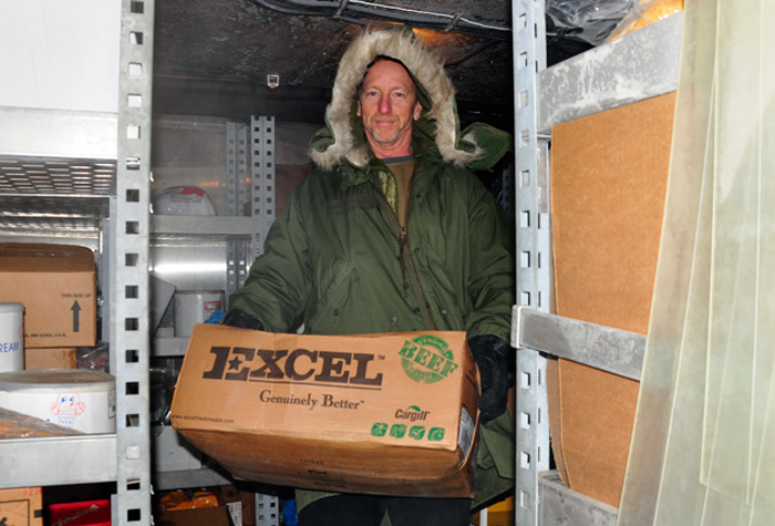 Steward Larry Jackson stocks the walk-in cooler with a big variety of fresh fruits and vegetables. Bananas, oranges, apples, and kiwi fruits are available for snacks at all hours of the day and night.
