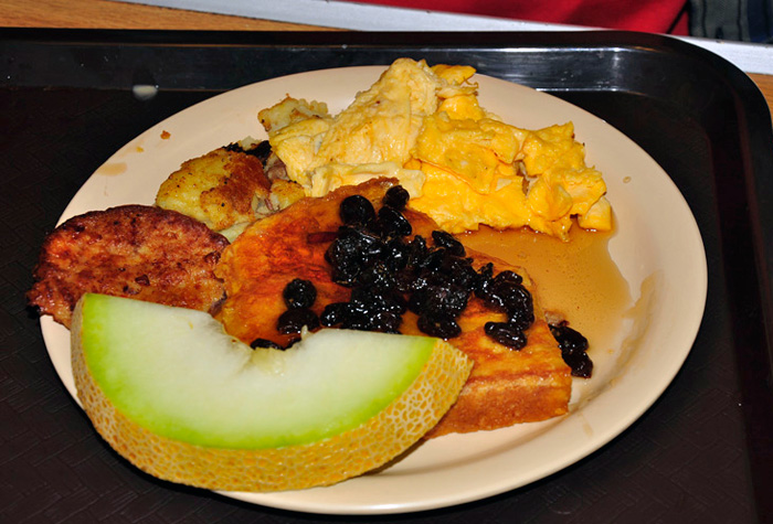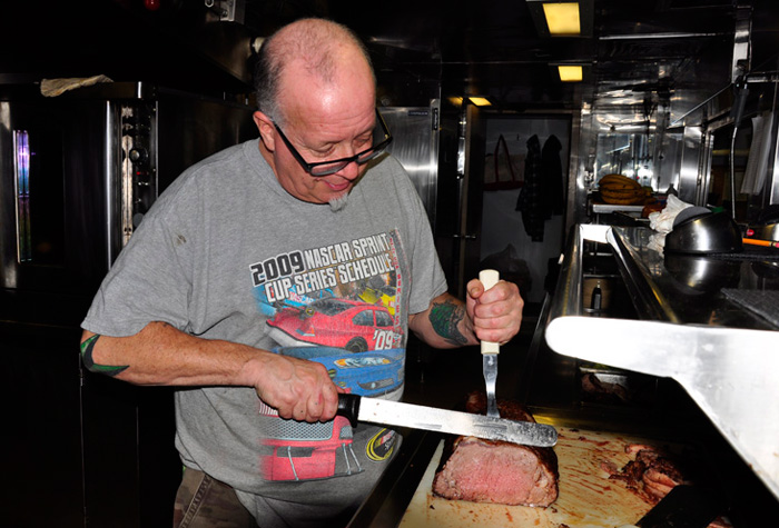 Cook Mark Nossiter slices roast beef for the hungry crew, science party, and Jason team aboard the R/V Atlantis. The galley crew also offers vegetarian dishes at every meal.