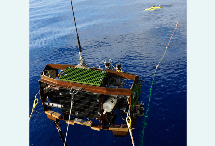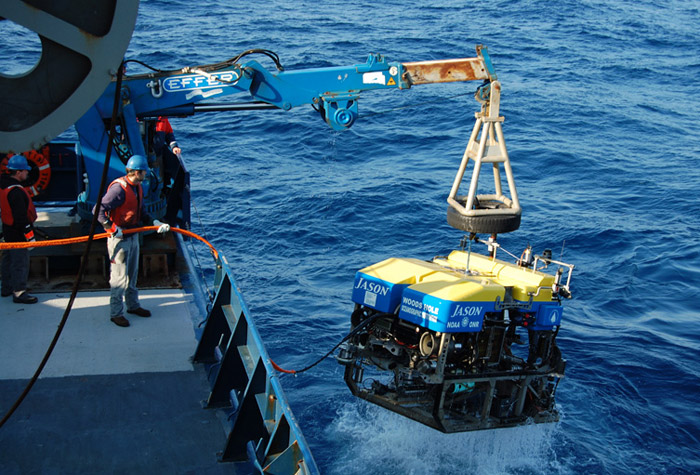 One of the best times to see how Jason and Medea are linked is when they are in the process of being recovered back aboard ship. The two vehicles come to the surface at the same time, but the team is careful to keep their tether fully extended so it doesn’t tangle and the vehicles don’t bump each other. Medea is brought aboard first. Then Jason is driven to a spot farther aft for recovery.