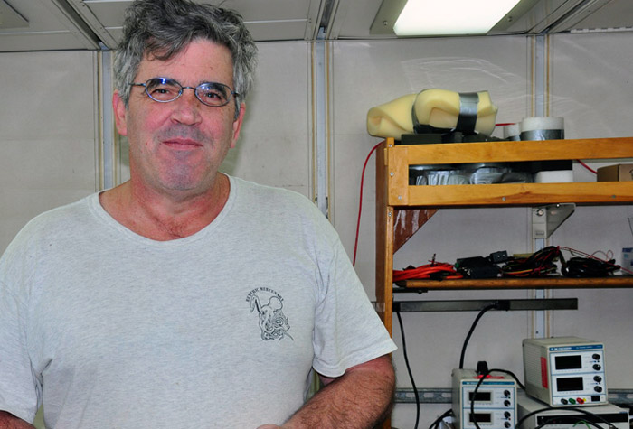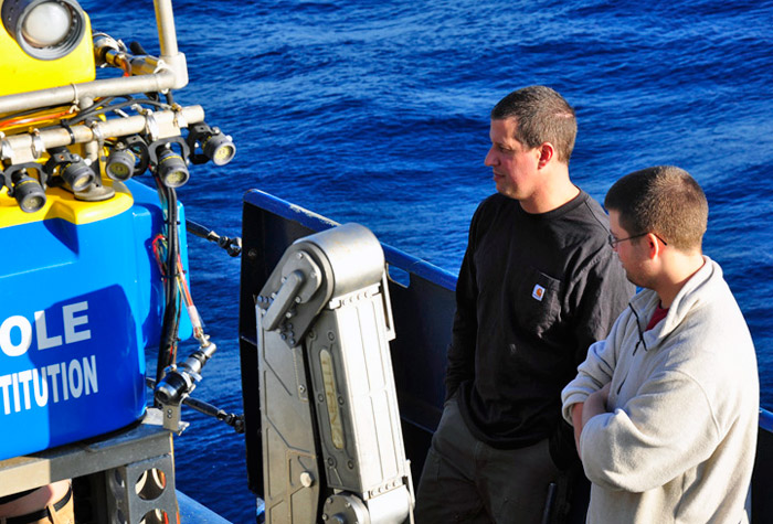 Jason pilots Akel Kevis-Stirling and Ben Tradd remove one of the remotely operated vehicle’s (ROV’s) rear thrusters for a minor repair after a dive. The team carefully inspects Jason and Medea after every dive and is able to repair or replace almost any part that becomes damaged.