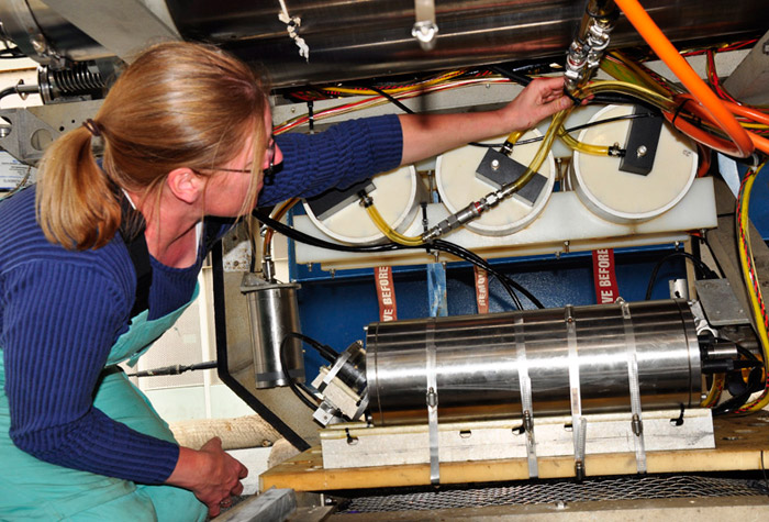 Jason engineer Lisa Borden adjusts one of the ROV’s hydraulic lines at port in Piraeus, Greece.