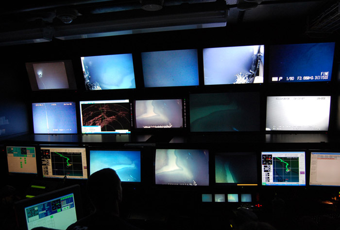 What the pilot sees: Ben Tradd (front lower left) uses video images from Jason’s many cameras to direct it in its scientific mission. The screen just to his left monitors various systems on the ROV. The control room, or van, is in two shipping containers that the team connects together. The Jason crew sits directly in front of the screens. The lead scientist for the dive sits behind the pilot’s right shoulder. Two other scientists sit farther back, where they monitor the action and record photos and video of notable events. Photo by Thorsten Stoeck.