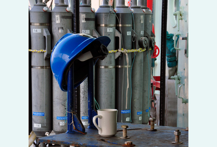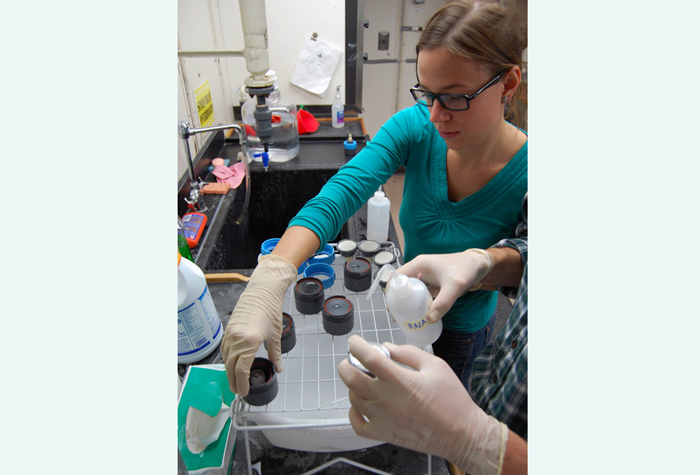 Konstantinos Kormas inoculated small bottles with bacteria from the mat on pushcores from a DHAB. He then used a syringe to replace the air in the bottle (which contains oxygen) with nitrogen, to keep the bacteria in an oxygen-free environment until they reach a laboratory where scientists will try to culture them.
