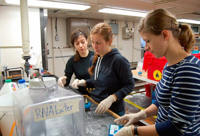 Maria Pachiadaki, Sabine Filker, and Alexandra Stock prepare to rinse SID-ISMS filter chambers with RNALater, a solution that will prevent RNA in the samples from degrading during the trip back to the surface. Photo by Thorsten Stoeck.