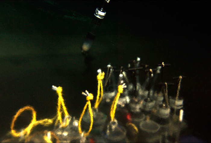 One of the weirdest sights of the cruise came when ROV Jason dipped into a DHAB. The movement of the vehicle caused slight mixing of water of different densities, which created the Schlieren effect, the shimmery waves seen here. Notice that the injection core held in Jason’s hand is above the level of mixing. The water there is clear.