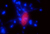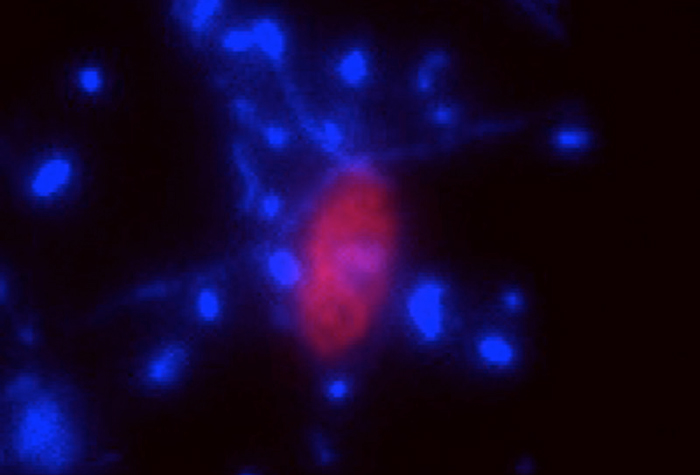 One procedure used on collected protists is FISH—fluorescence in situ hybridization. Fluorescent tags are attached to RNA fragments that bind to specific kinds of cells. In this FISH image of a protist collected in 2009, the red comes from an RNA probe that identifies dinoflagellates. The blue comes from DAPI, a fluorescent dye that binds to DNA. The small blue bodies are bacteria. The nucleus of the dinoflagellate is visible as a lavender spot within the red cytoplasm. Photomicrograph by Bill Orsi.