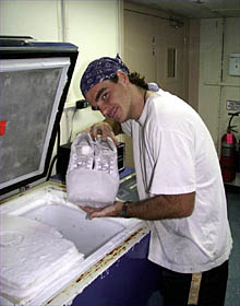 Meanwhile, back on board Atlantis, the students had prepared a little surprise for Capt. McGee... they froze his sneakers solid in the -70 degree C freezer!