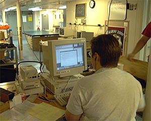 Margo Edwards analyzes Towed Camera Sled photographic data at her computer in the main lab on RV Atlantis.