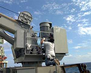 Ed Popowitz chips rust from the railing on the crane to prepare it for painting.