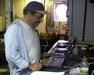 Dana works on his laptop computer in the Hydro Lab. He will take it inside Alvin to log data.
