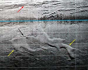 in this DSL-120 sonar record. The two yellow arrows point to the