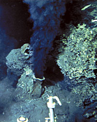Superheated water at freezing depths On April 21, 1979, Alvin dove in search of hydrothermal vents. Bill Normark of the U.S. Geological Survey and Thierry Juteau, a French volcanologistst, were the scientific observers. The pilot was Dudley Foster. He followed a trail of white clams on the seafloor. By now, everyone knew they would likely lead to vents. Suddenly, the scientists came upon something no human had ever seen before. A tall spire of rock, about six feet tall, was sticking out of the seafloor. A jet of black fluid spewed out of the toplike smoke out of a chimney. Foster said it looked like smoke belching out of the smokestack of a steaming locomotive. Foster approached to take a closer look. Hot, black fluids rushed powerfully upward from the chimney-like rock. It created an updraft that made it harder to steer Alvin. Foster knocked into the chimney. It crumbled, making a wider hole that let out a billowing cloud of black smoke. It became harder to see. Using Alvins manipulator arm, Foster grabbed a probe to measure the temperature of the fluids. The reading inside Alvins sphere zoomed as high as it could goto 32.7°C (91°F). The scientists thought it was a mistake and tried again. Again, the temperature reading shot up to the limit. By now, Foster wanted to get out of the black cloud and moved on to another vent. He didnt even bother to take a temperature reading because he assumed the probe wasnt working properly.