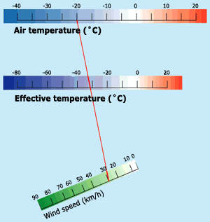 To estimate effective temperature, draw a line from the appropriate point on the top scale (air temperature) to the appropriate point on the wind-speed scale at the bottom. The effective temperature is the point at which the line crosses the middle scale. In the example, a wind speed of 30 km/h (bottom scale) lowers a temperature of minus 20°C (top scale) to an effective temperature of 31°C (middle scale).