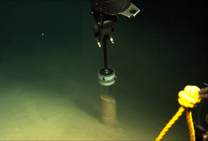 Pushcores are clear polycarbonate tubes about 13 inches long and 2.5 inches in diameter. They work by being pushed down into the seafloor. When they are pulled out, a vacuum forms and keeps a “core” of sediment in the tube. These four photos were taken by Jason’s hi-definition science camera.