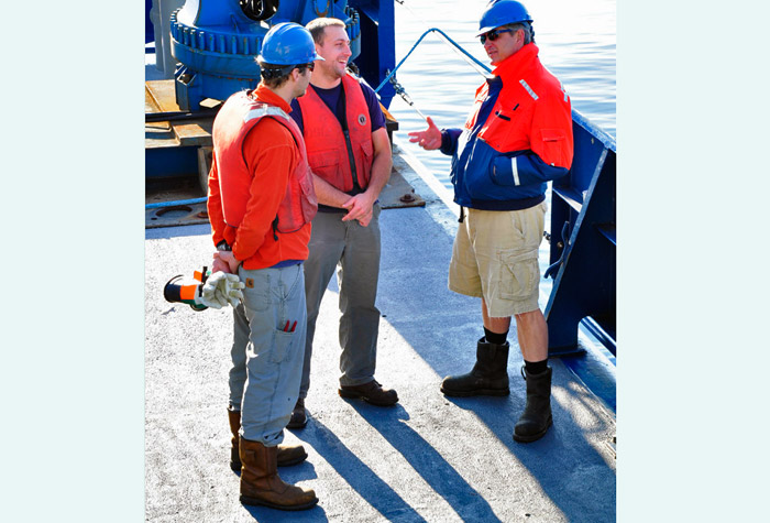 (l-r) Dara Scott, Ben Tradd, and Expedition Leader Tito Collasius share a relaxed moment before recovering Jason and Medea after a dive to a Deep Hypersaline Anoxic Basin.