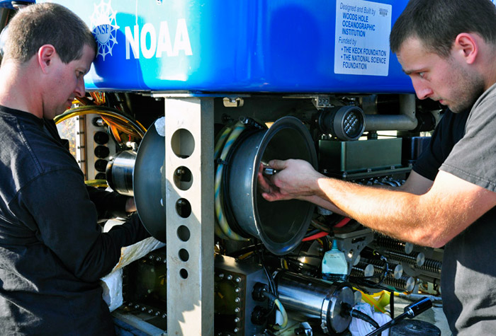 Jason pilots Akel Kevis-Stirling and Ben Tradd remove one of the remotely operated vehicle’s (ROV’s) rear thrusters for a minor repair after a dive. The team carefully inspects Jason and Medea after every dive and is able to repair or replace almost any part that becomes damaged.