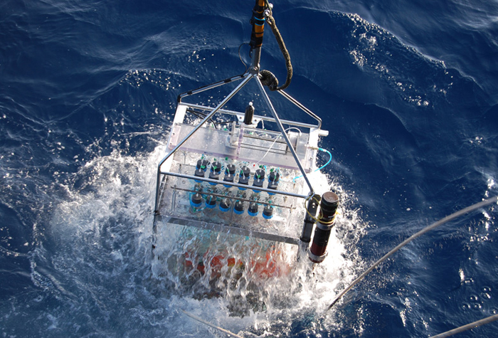The brand-new instrument SID-ISMS made its debut. Before the intense pressure at 3,500 meters depth grounded it, SID-ISMS collected and preserved samples of water from the DHABs, haloclines, and normal seawater just above the DHABs. Photo by Thorsten Stoeck.
