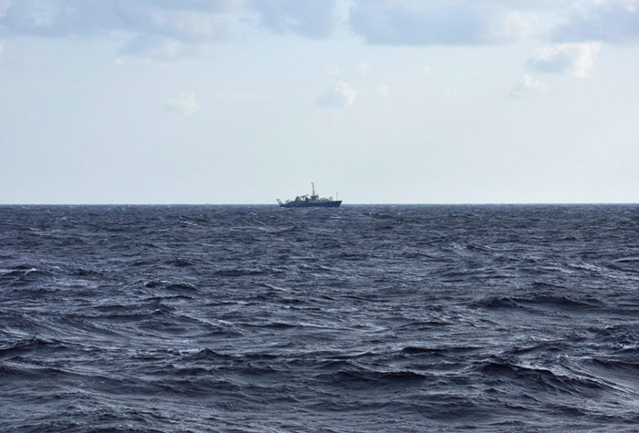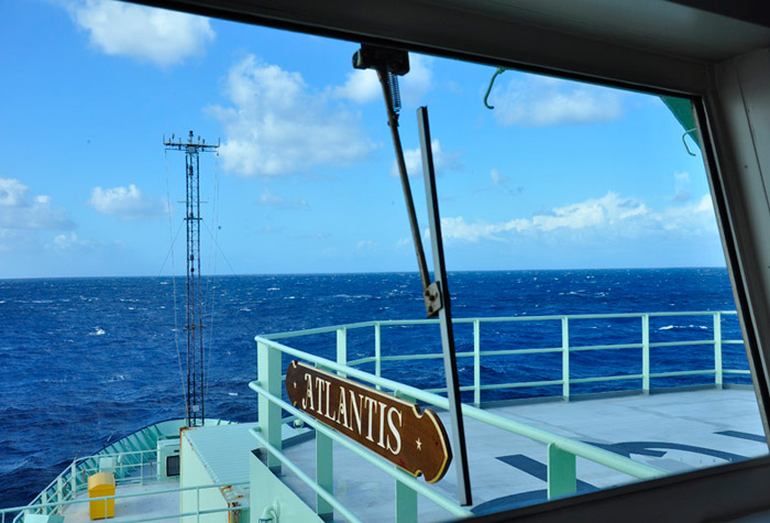 A view from the bridge of the research vessel Atlantis, looking out over the bow of the ship. Yes, that’s a windshield wiper you see!