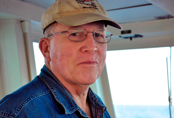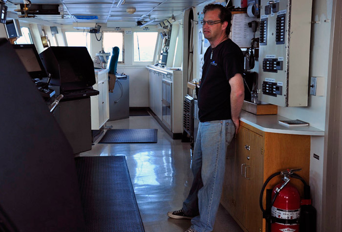Second Mate Carl Christensen stands watch on the bridge on the last day of the cruise—the final cruise of his WHOI career.
