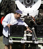 | Dana checks the installation of the doppler sonar on Alvins basket. The doppler provides very accurate information on the subs speed and altitude during each dive. |