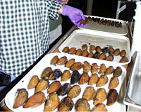 | Vent mussels are spread out on trays after they are cleaned and measured. |