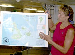 | Karen discussing her research on Genovesa Island at one of the science meetings. |