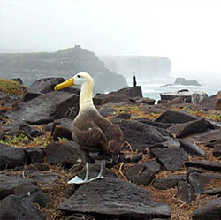 The waved albatross is found only on Espanola Island in the Galápagos; the only place in the world where it nests and reproduces. It lives in the Galápagos from mid-April to mid-December, and spends the other six months on the open ocean as far away as Japan. This albatross is the largest bird in the Galápagos, with a wingspan of over 2.5 meters. These birds feed at night, far from shore. (Photo by Rob Otto, 2001)